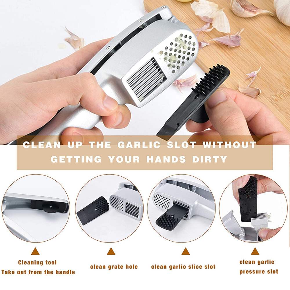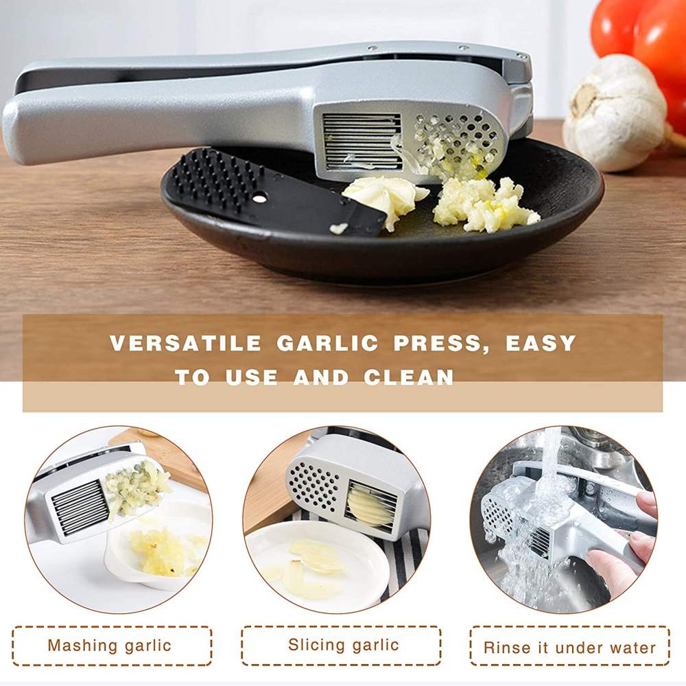 Garlic Press, 2-in-1 Mince Garlic and Garlic Slice with Garlic Cleaner Brush and Silicone Tube Peeler