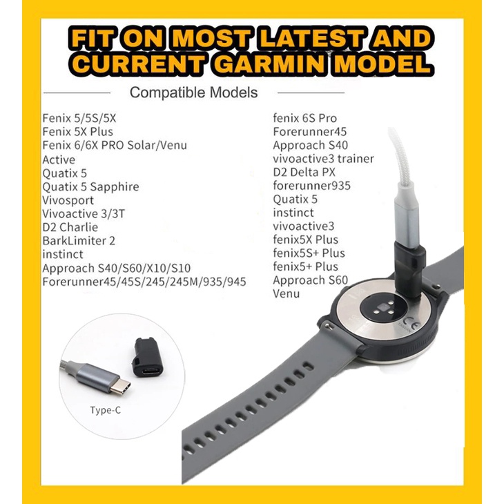 Garmin Charger Fenix 5 5X 6X Charging Cable Forerunner 945 935 245 745 Venu SQ Vivoactive 3 Instinct Venu Type-C Adapter