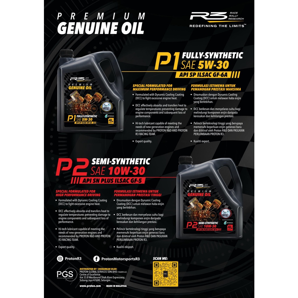 Genuine Proton P1 Fully Synthetic SAE 5W-30 5W30 Premium R3 High Performance Engine Oil 4L + Oil Filter PW811577R3