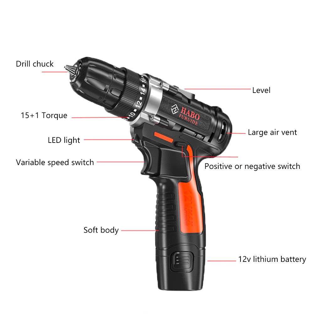 Gerudi Tanpa Wayar 12V Cordless Drill with FREE Case - HABO Screwdriver Handheld Electric Power Drills Gerudi Elektrik
