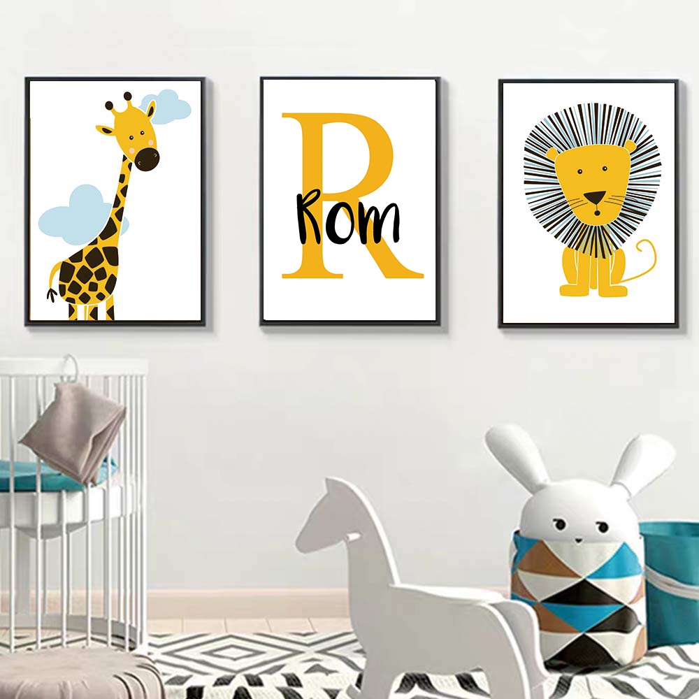 Giraffe Lion Baby Animal Poster Boy's Custom Name Canvas Print Nursery Wall Art Paintings Nordic Kids Room Picture Wall Decor