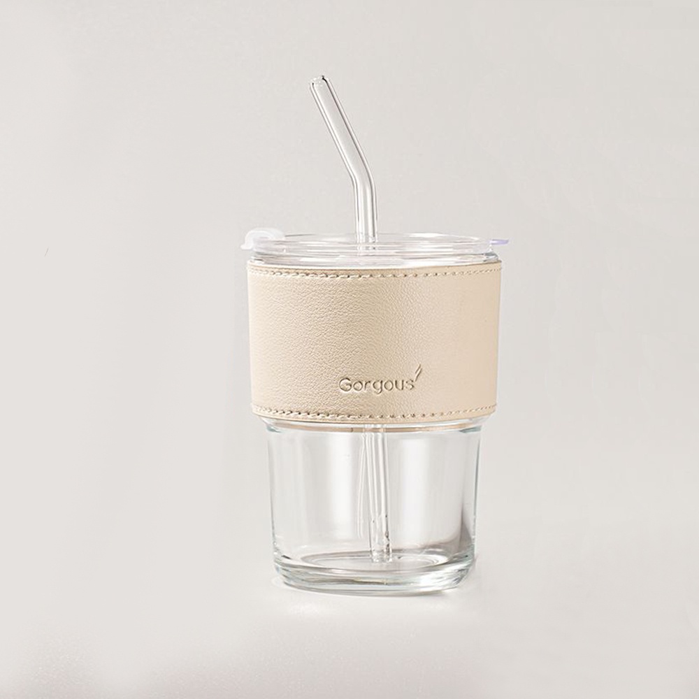 Glass Straw Cup with Lid Heat Cold Resistant Iced Water Bottle Viral Coffee Glass Mug Transparent Travel Mug Leather