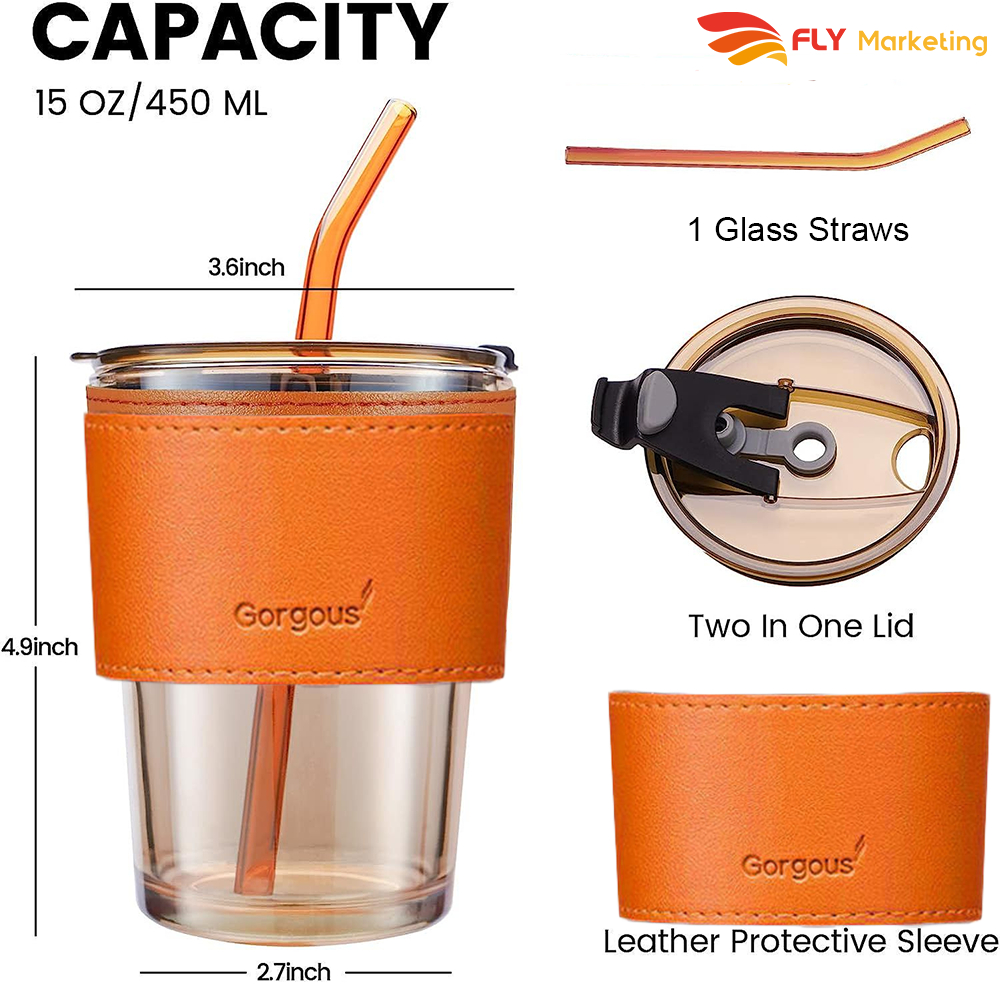 Glass Straw Cup with Lid Heat Cold Resistant Iced Water Bottle Viral Coffee Glass Mug Transparent Travel Mug Leather