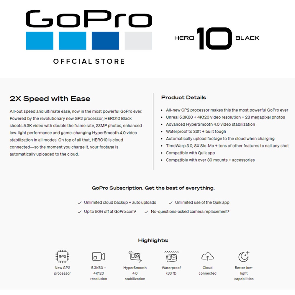 GoPro HERO10 Black 5.3K Video and 23MP Photos GP2 Processor Hypersmooth 4.0 With 1 Year Warranty