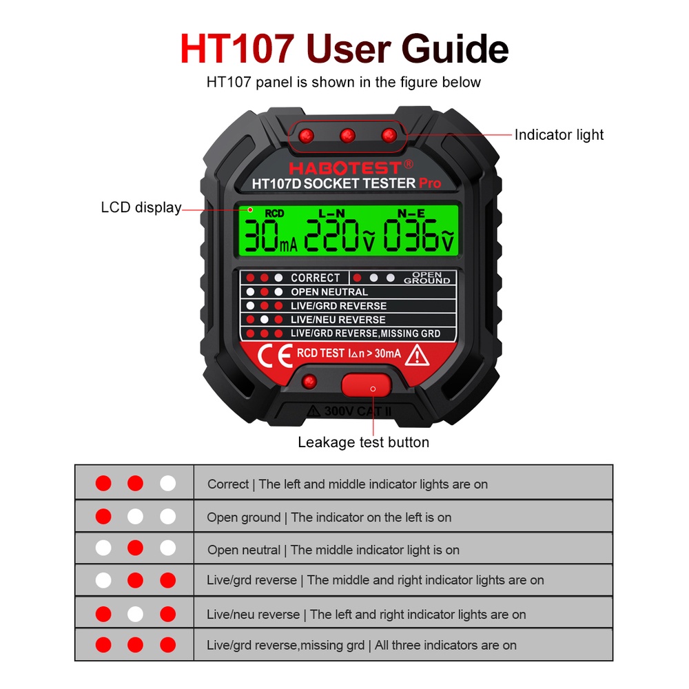 HABOTEST HT107 Pro Socket Tester Voltage Test Socket Detector EU Plug Ground Zero Line Plug Polarity Phase Check