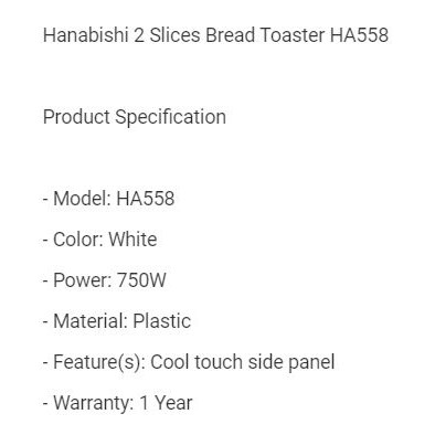 HANABISHI 2 SLICE BREAD TOASTER HA558