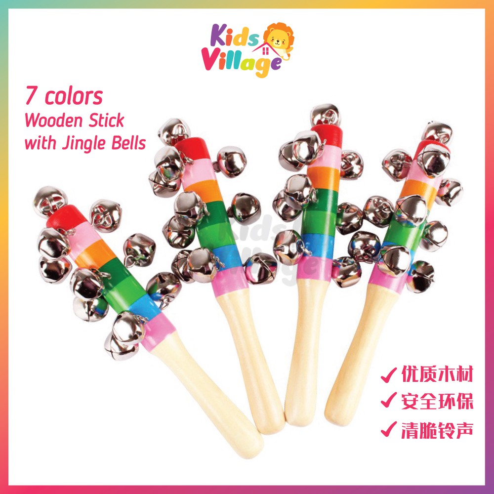 HANDHELD 7 COLORS WOODEN STICK WITH 10 JINGLE BELLS COLORFUL RAINBOW MUSICAL TOY