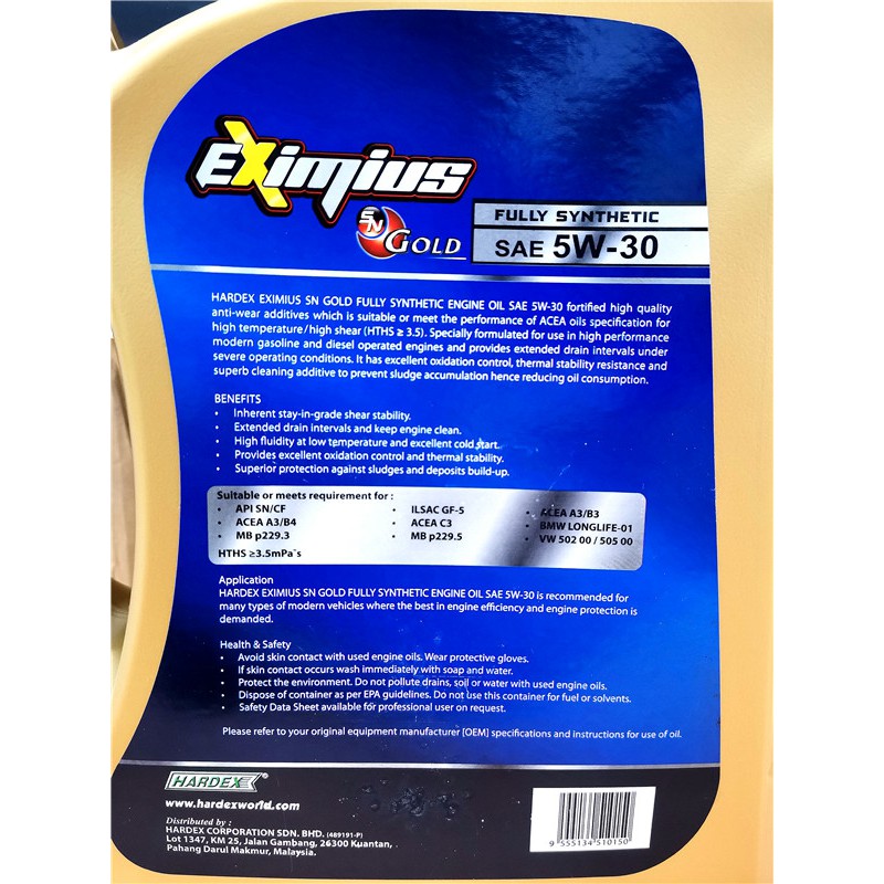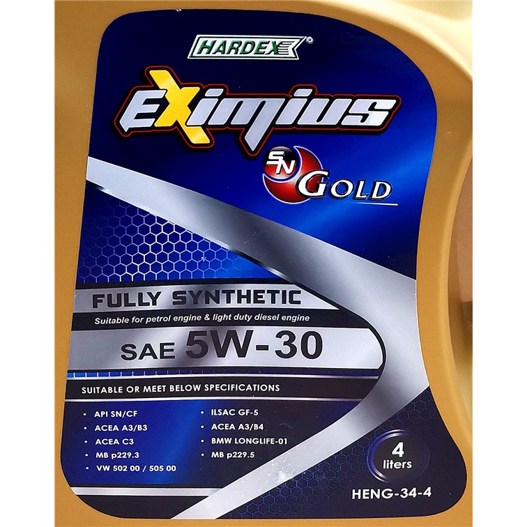 HARDEX EXIMIUS SN GOLD Fully Synthetic SAE SN 5W-30 4L ENGINE OIL Lubricant Oil timemax