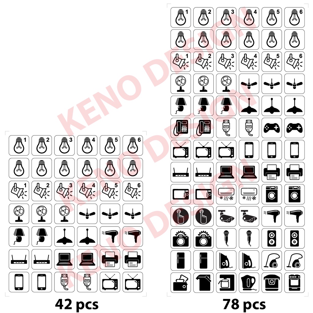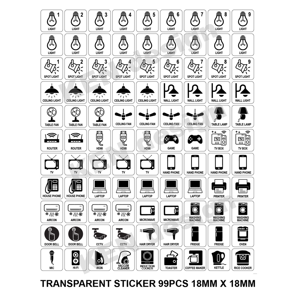HOME APPLIANCES SWITCH TRANSPARENT STICKER 15X15MM, LIGHT, TV, SPORT LIGHT, FAN, TABLE LIGHT, ROUTER, LAPTOP, HAIR DRYER