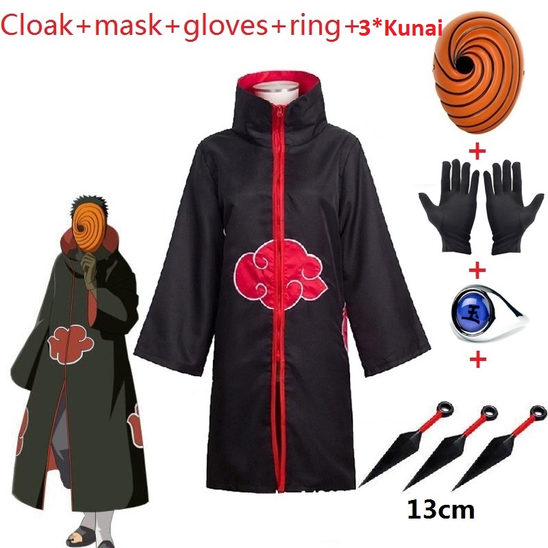 HOT Children/Adults Anime Cosplay Costume Naruto Akatsuki Cloak Robe Halloween Uchiha Obito Tobi Mask Shoe Ring Kunai