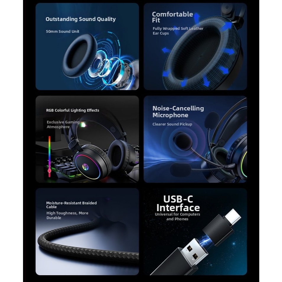 HP GH100 WIRED GAMING HEADSET WITH VOLUME CONTROL, BUILT IN MICROPHONE., DUAL USB/USB-C INTERFACE OVER-EAR HEADPHONE