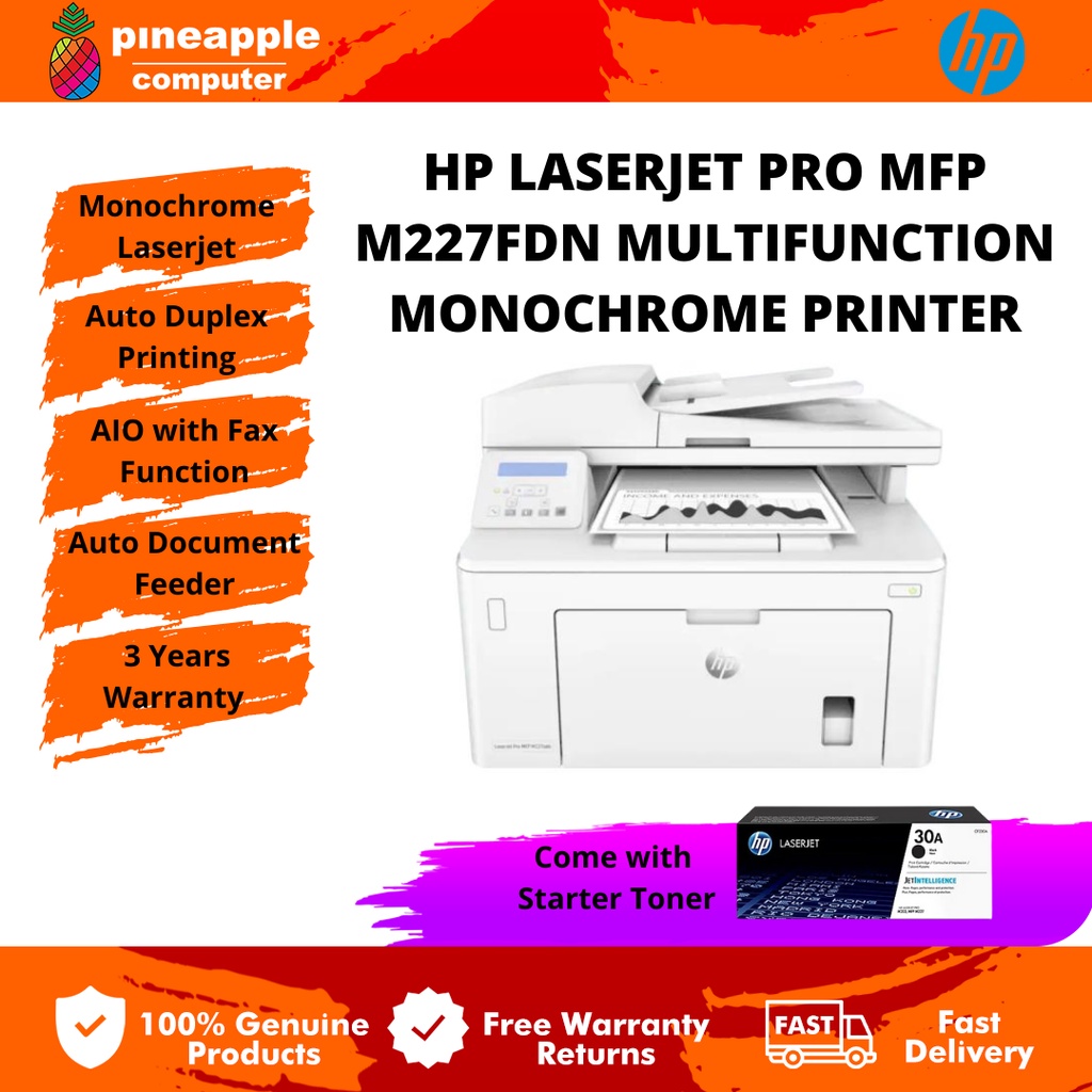 HP LaserJet Pro MFP M227FDN Mono Laser Printer (G3Q79A) - Print, Scan, Copy, Fax, Auto Document Feeder, Auto Duplex