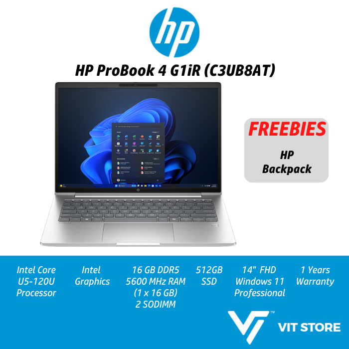 HP ProBook 4 G1iR C3UB8AT Intel Core U5-120U Intel Graphics 16GB DDR5 512GB NVMe SSD 14" WUXGA W11Pro 1Y Laptop