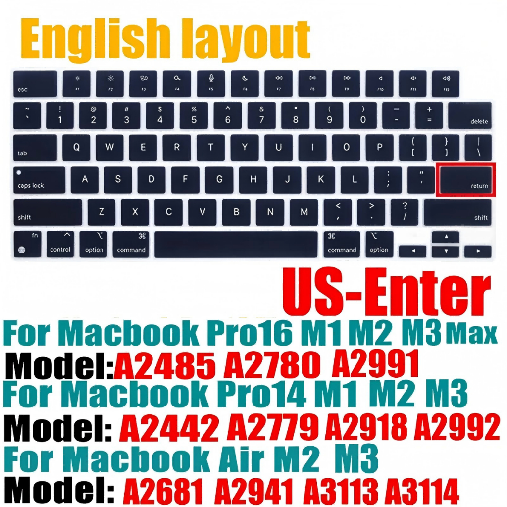 HRH Multilingual Black Silicone Keyboard Cover Skin US Layout ANSI for MacBook Air 13"15" M2 M3 M4 Pro 14"16" M1 M2 M3 M4Russian Arabic Korean Spanish Thai Taiwanese French Persian