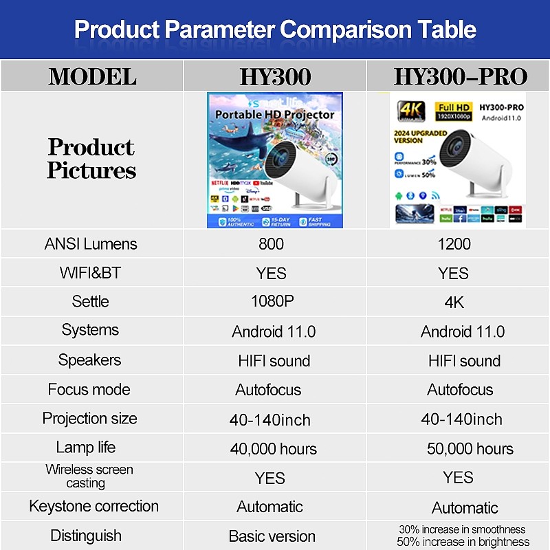 HY300 PRO Mini Projector 4k HD Smart projector portable Projector For Phone with wifi and bluetooth