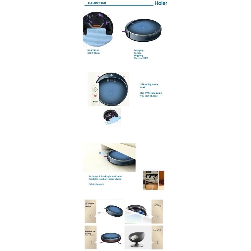 Haier Robot Vacuum Cleaner With Remote Control Wet & Dry Cordless HA-RVT360 HARVT360