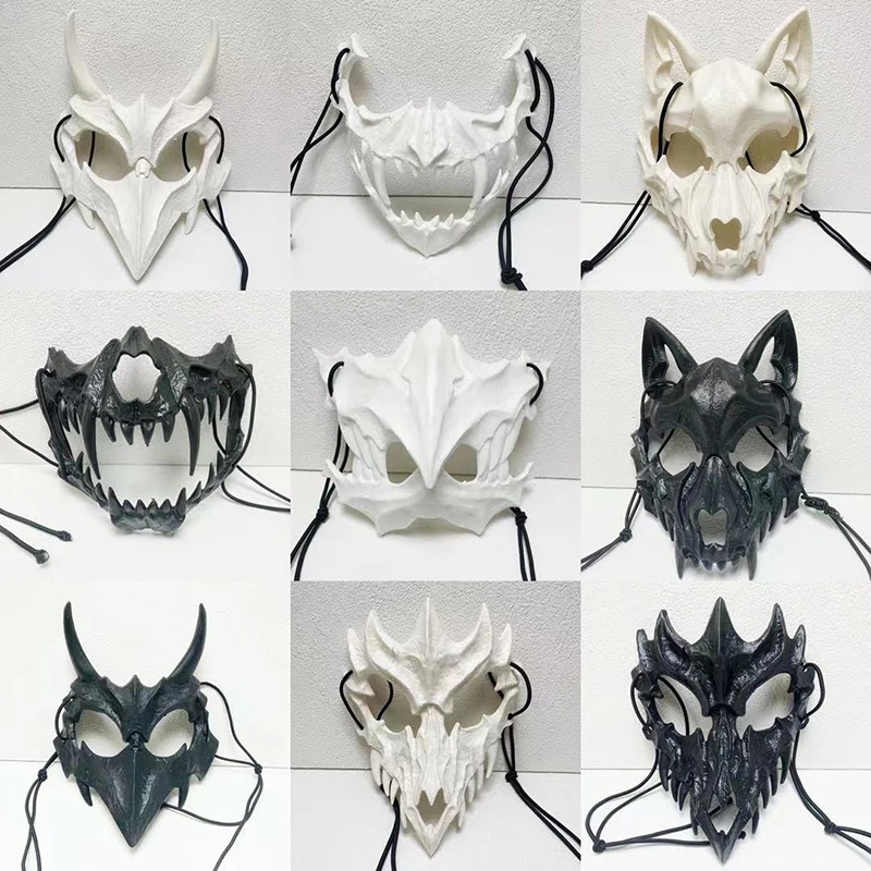Halloween Demon Samurai Dragon Bone Yasha Tengu Tiger Skull Half Face Mask/ Halloween Long Teeth Demon Skull Mask/ Cosplay Costume Mask Prop