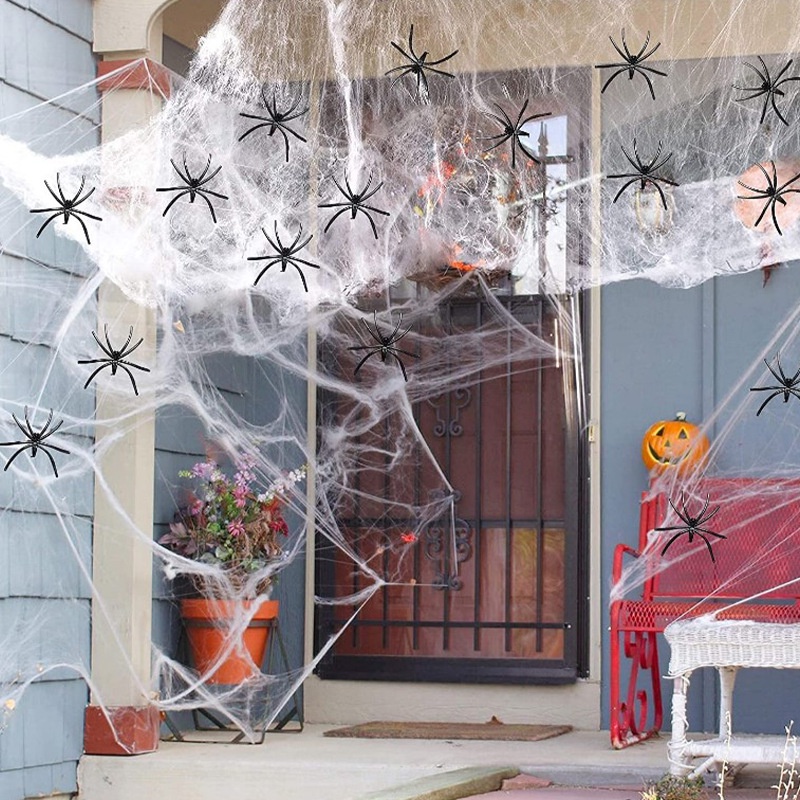 Halloween Spider Web Plastic Spider Party Decoration Spider Web Stretchable CobWeb Webbing Decorations with Spider for Halloween Fireplace Indoor Outdoor Decorations Props