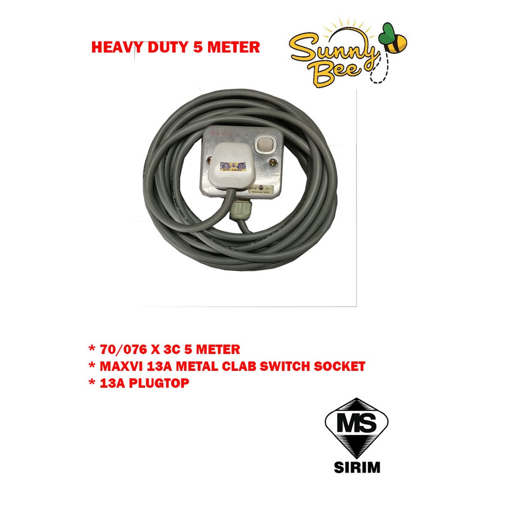 Heavy Duty Single Metal Clad 13A 1 Gang Trailing Switch Socket Extension Wire Cable leads with NEON plug