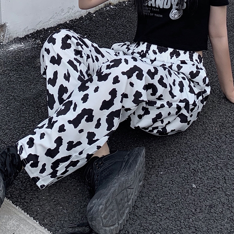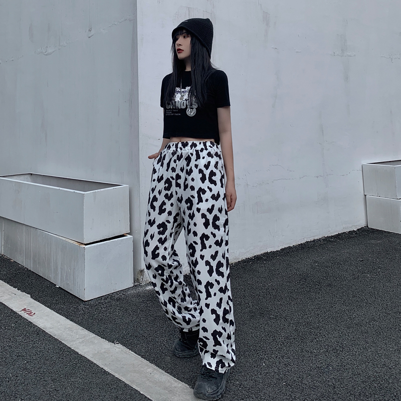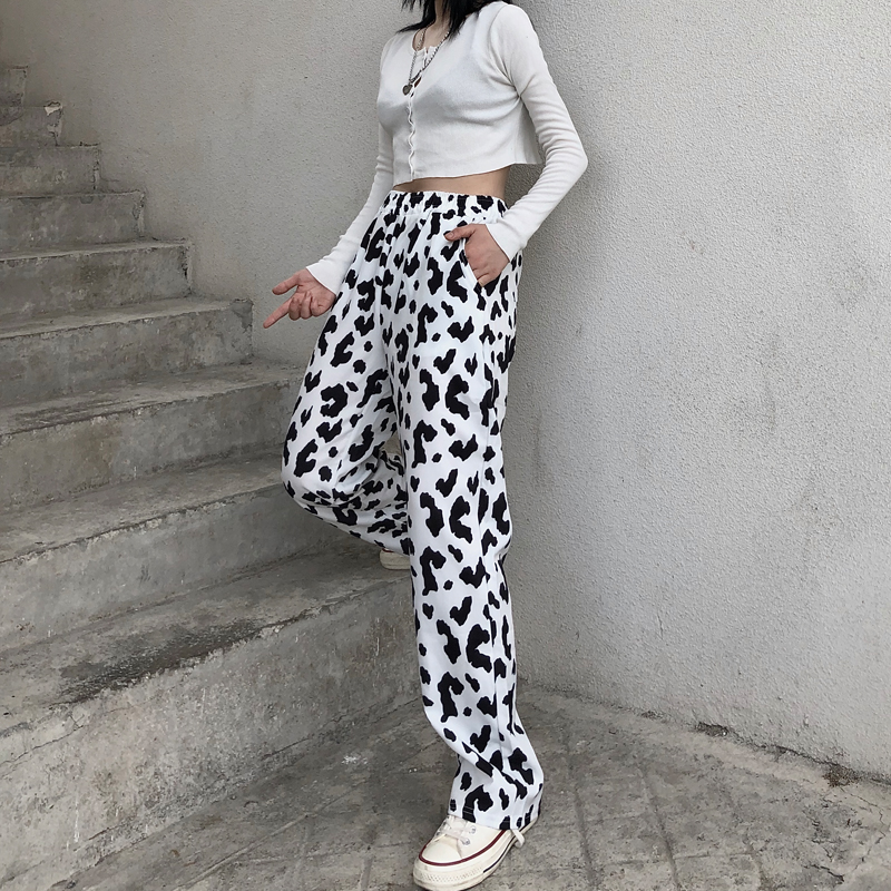 Vintage Time High Waist Plus Size Trousers Cow Pattern Print Contrast Color Casual Pants Straight ins Trendy Fat MM Women Drape Wide Leg Loose Student