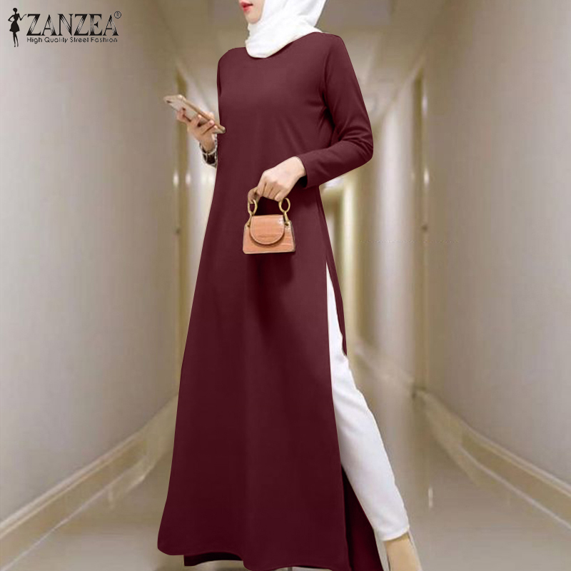 Hijabista Women Muslim Casual Elegant Kaftan Full Sleeve Solid Color Side Split Maxi Dress