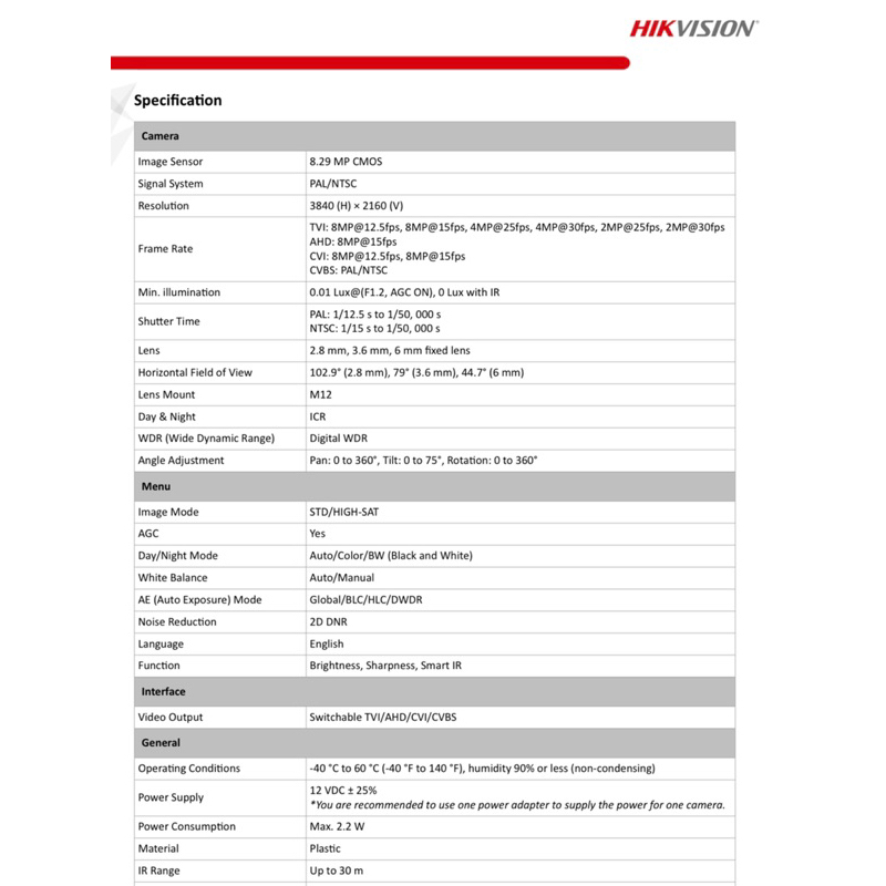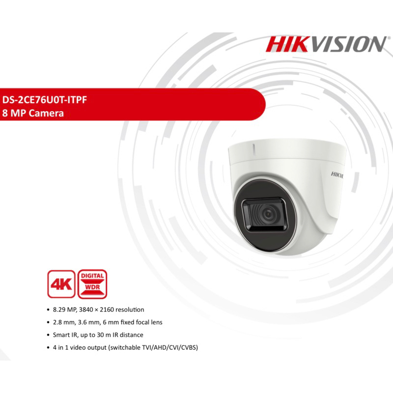Hikvision 4K 8MP 8 Mega Pixel HD 30m IR Indoor Turret Dome Analog CCTV Security Camera Plastic DS-2CE76U0T-ITPF