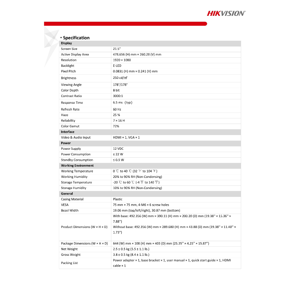 Hikvision DS-D5022FN-C 21.5 inch FHD Borderless Monitor - Hikvision CCTV Monitor - Hikvision 21.5" CCTV Monitor