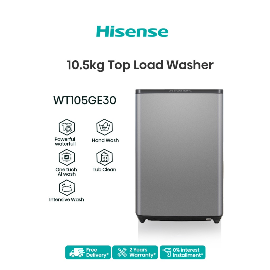[FREE Installation] Hisense 10.5kg Top Load Washing Machine /AI Wash /Power Soak /Tub Clean/Child lock/ Grey - WT105GE30