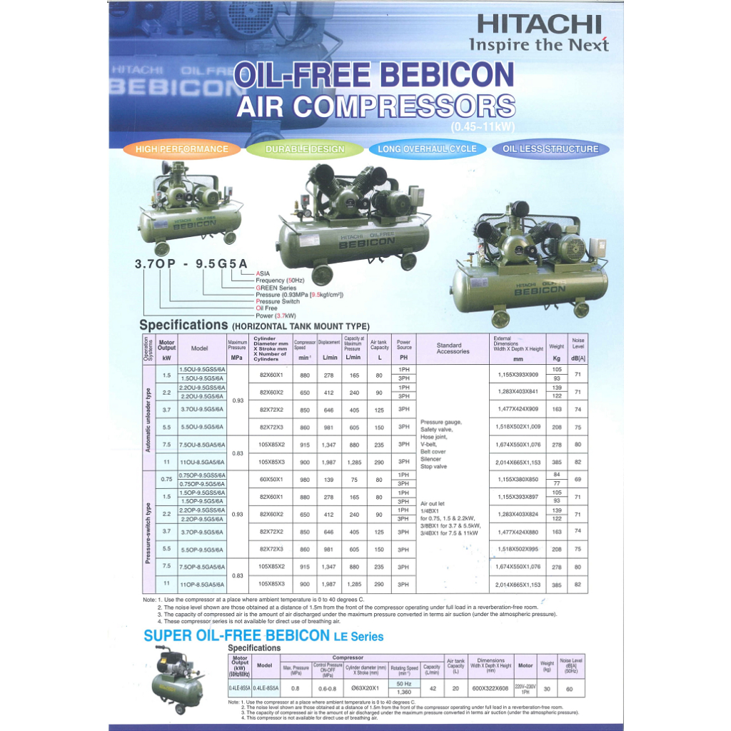 Hitachi Oil Free Bebicon Air Compressors 1.5OP-9.5G5A 2HP 415V 9.5Bar 165L/min 80L Tank 110kg