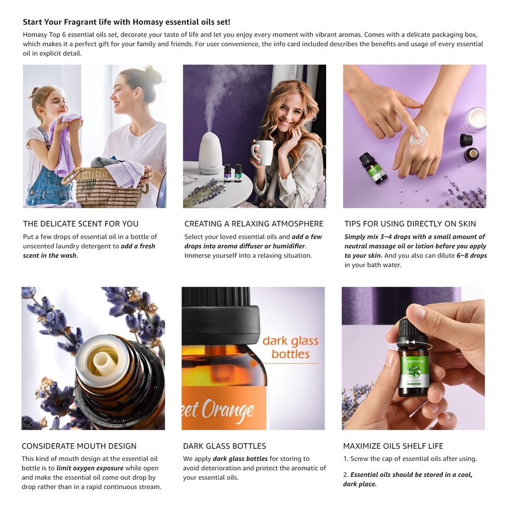 Homasy 100% Pure Natural Essential Oil Aroma Oil set for air humidifier aroma diffuser