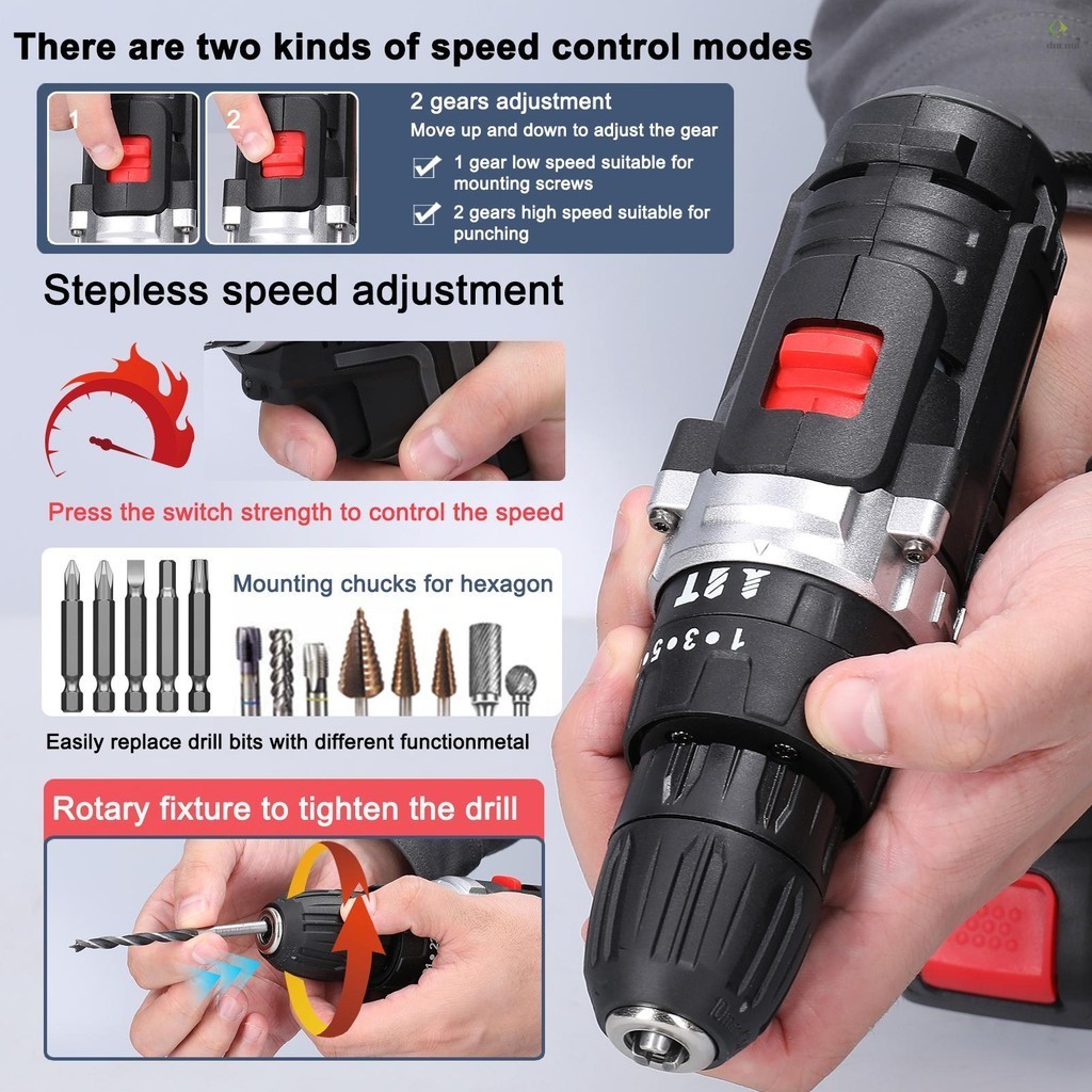 Household 3in1 Multifuctional Electric Drill Handheld Lithium Screwdriver 21V Impact Drill Brushed Motor 2 Speeds Control Stepless Speed Regulation Rotation Ways Adjustment 25 Gear