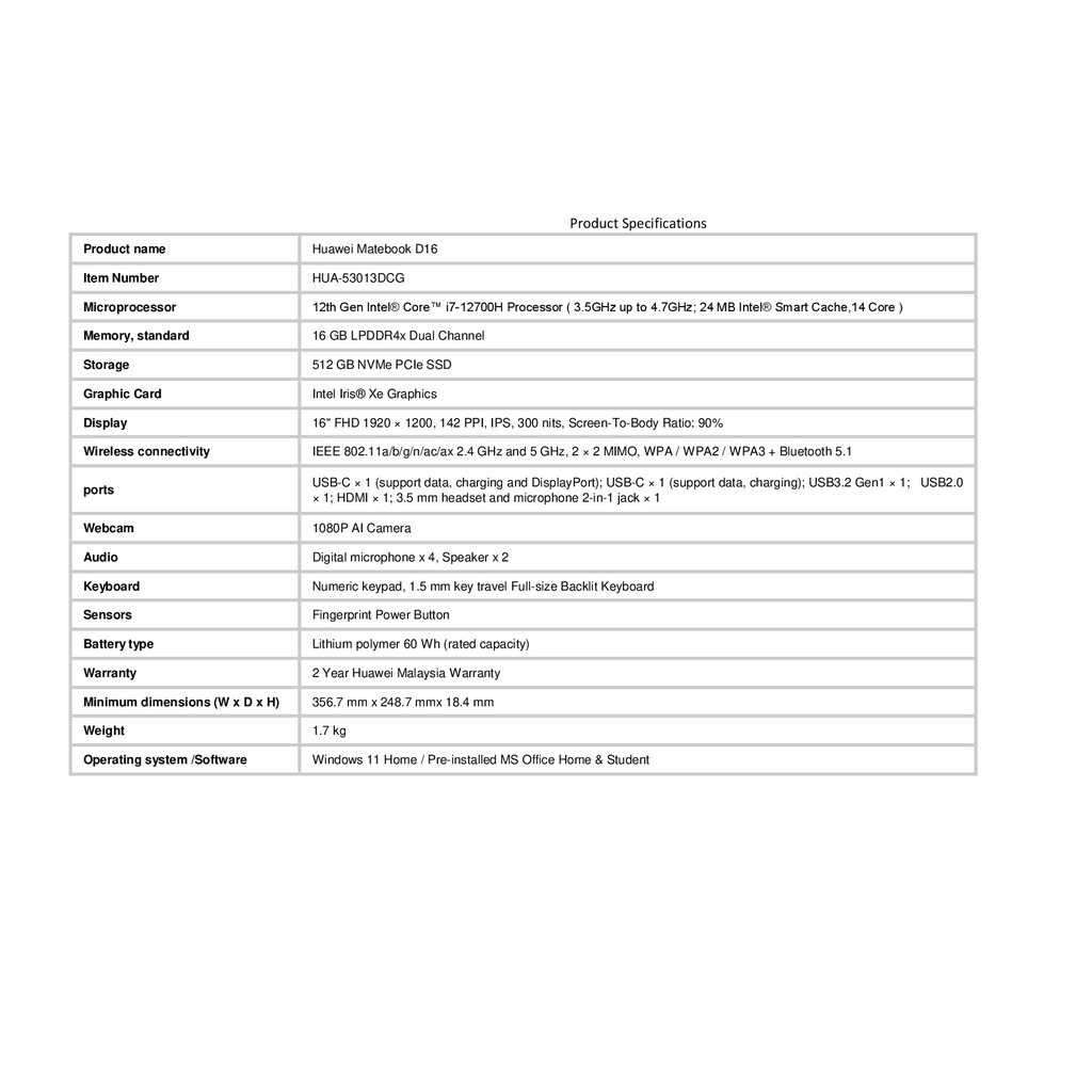 Huawei MateBook D 16 D16-3DCG 16'' FHD Laptop Silver ( I7-12700H, 16GB RAM, 512GB SSD, Intel, W11, HS )
