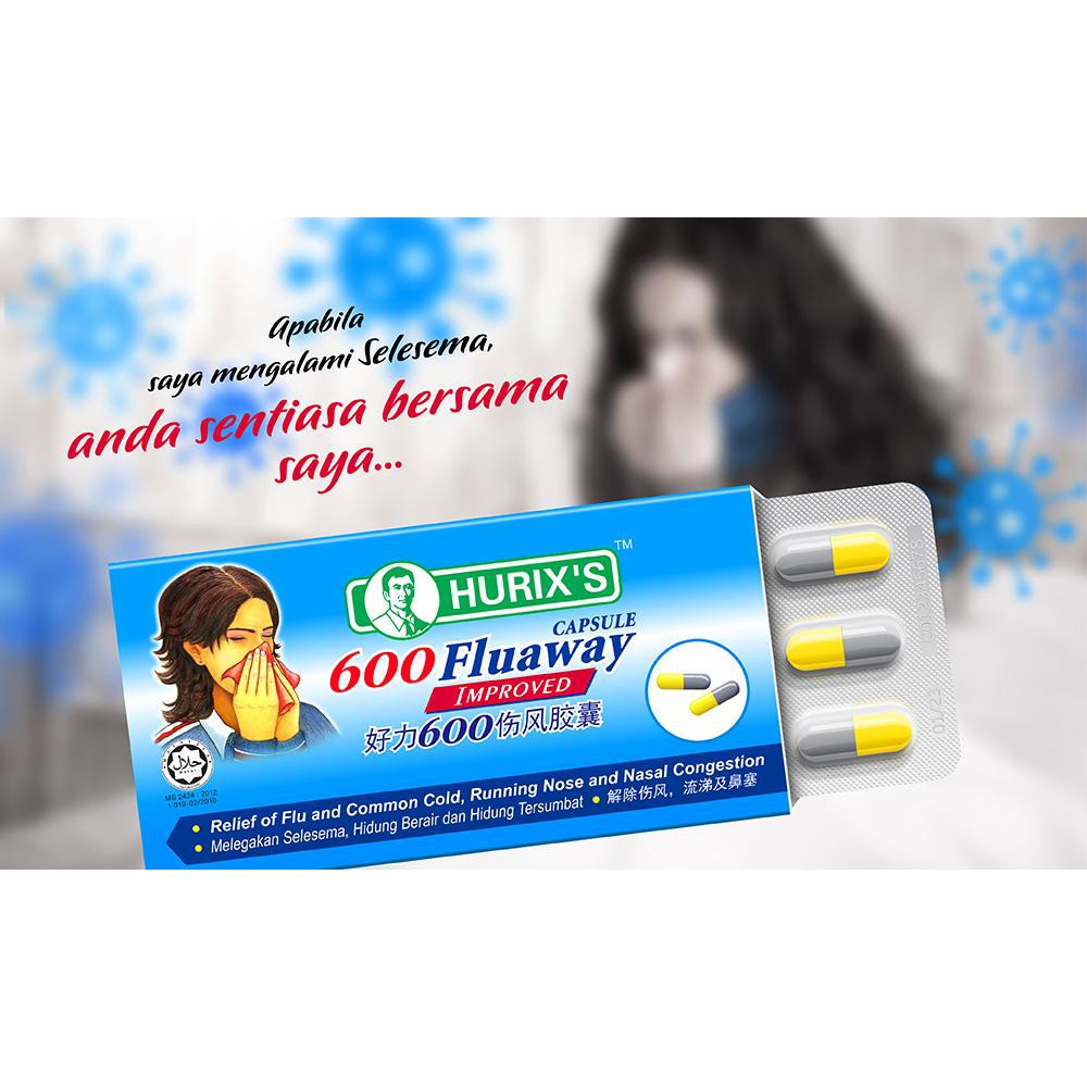 Hurix 600 Fluaway Improved Capsules 9s Flu, Cough, Nasal Congestion Ubat Demam, Selsema