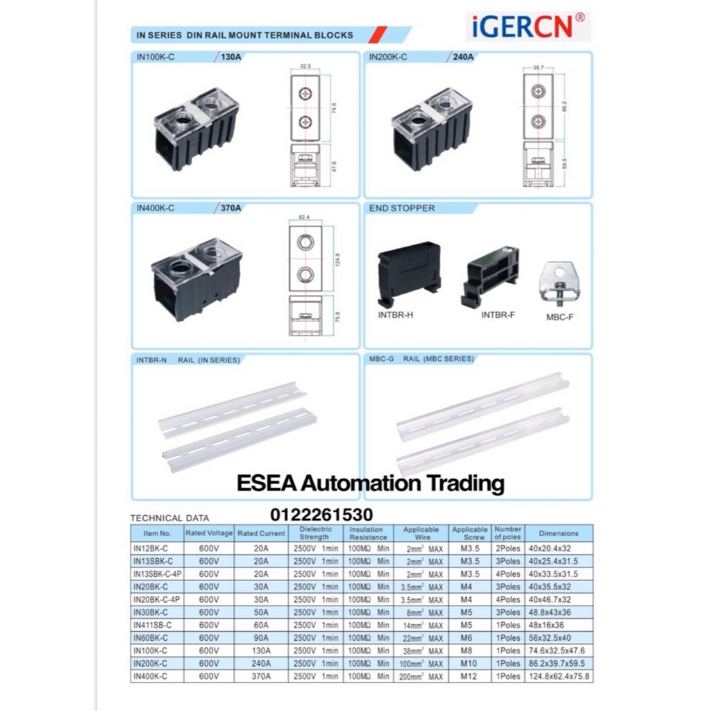 IN SERIES Terminal block Din rail (IN12BK/IN13BK/IN20BK/IN30BK/IN411S/IN60BK/IN100BK