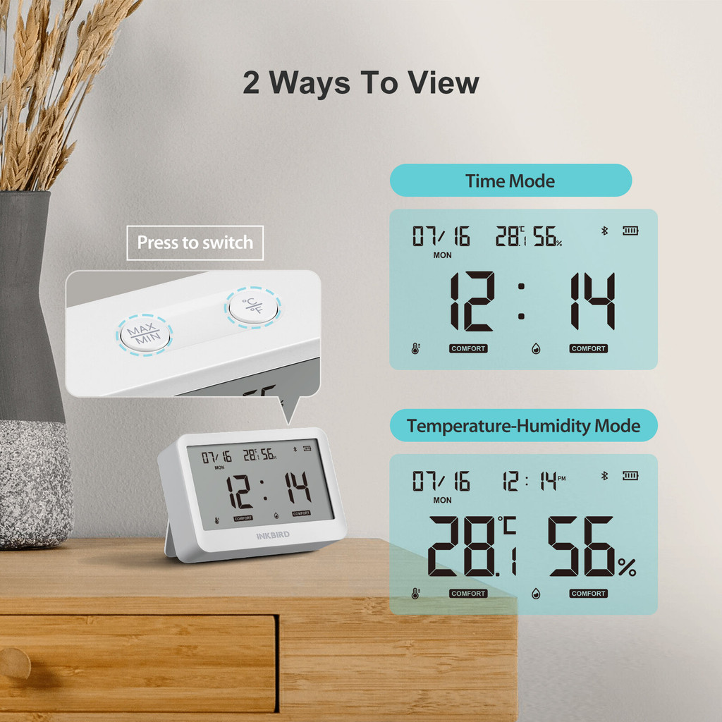 INKBIRD ITH-21-B 6-in-1 Bluetooth Smart Thermo-Hygrometer Clock Indoor Temperature Humidity Monitor with Time Date logged APP Control