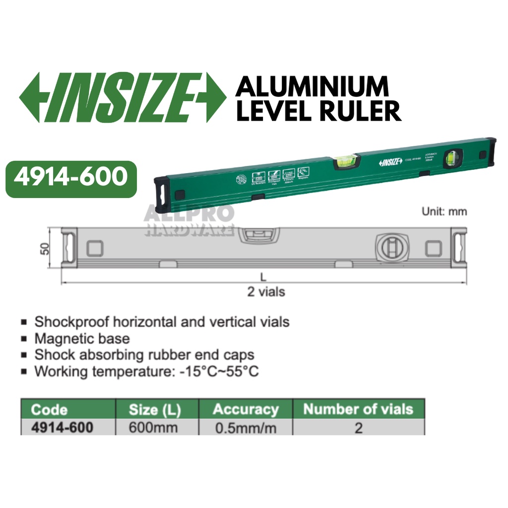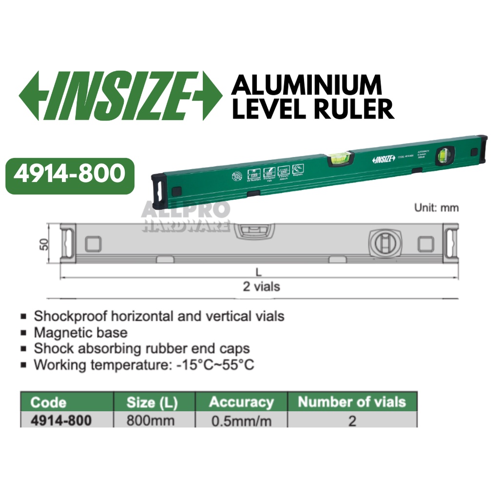 INSIZE 300mm / 600mm / 800mm Aluminium Spirit Level Ruler Measurement Tool Measuring (4914-300) (4914-600) (4914-800)