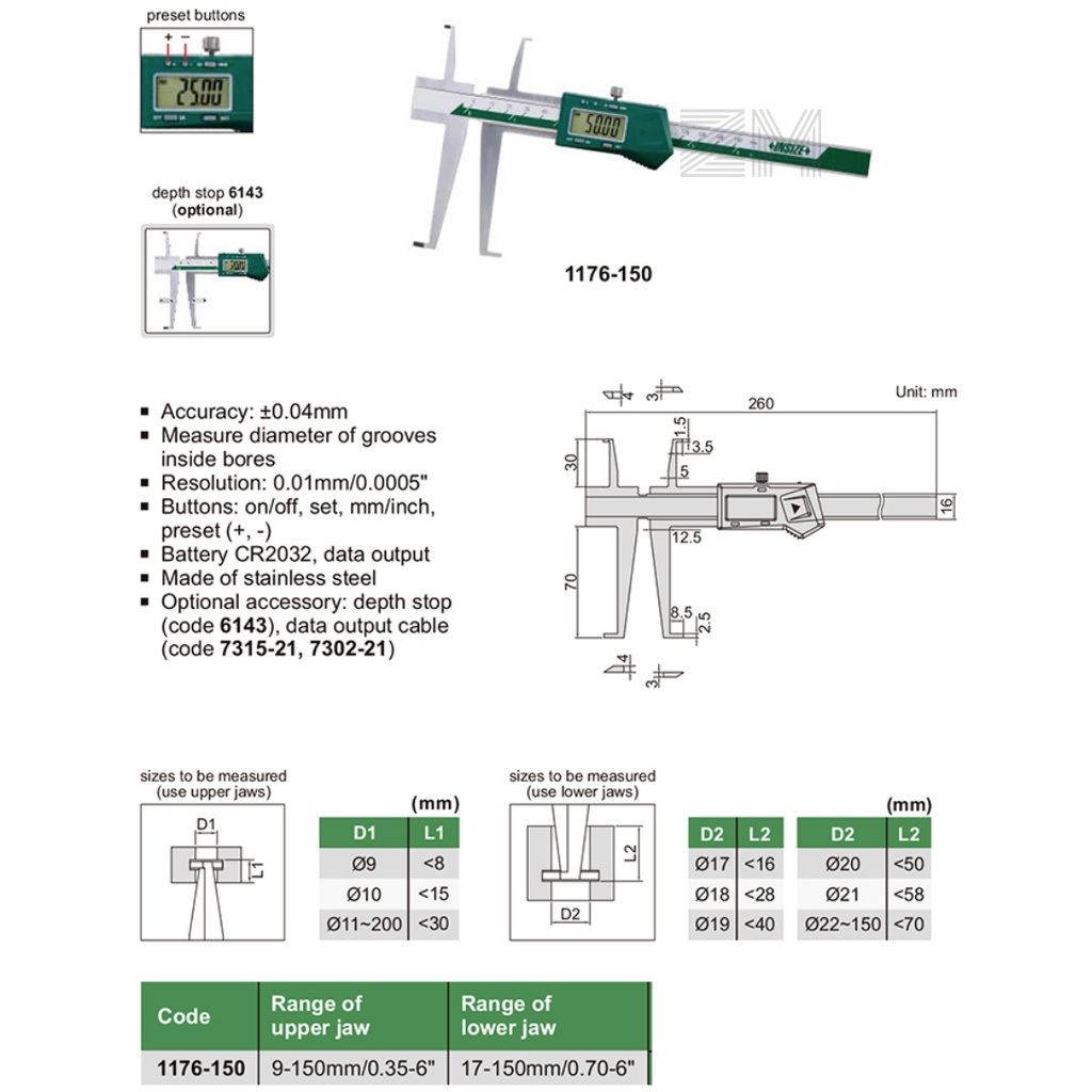 INSIZE Digital Inside Groove Caliper, Upper Jaw 35-6" 9-150 mm Lower Jaw 59-6" 15-150 mm (1176-150)