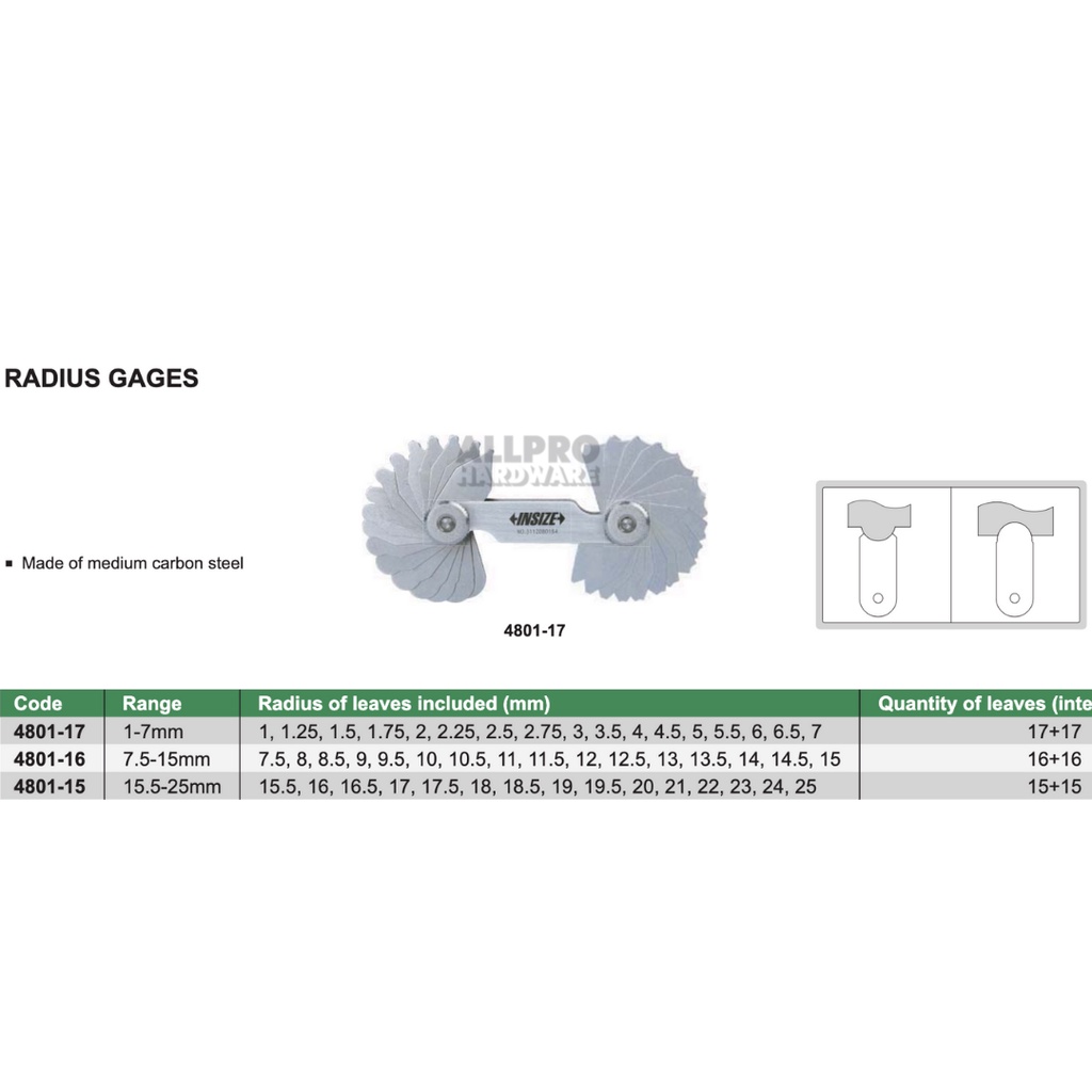 INSIZE Radius Gauge / Radius Gage Metric Engine Cylinder 4801-17 (1-7mm) / 4801-16 (7.15mm) / 4801-15 (15.5-25mm)