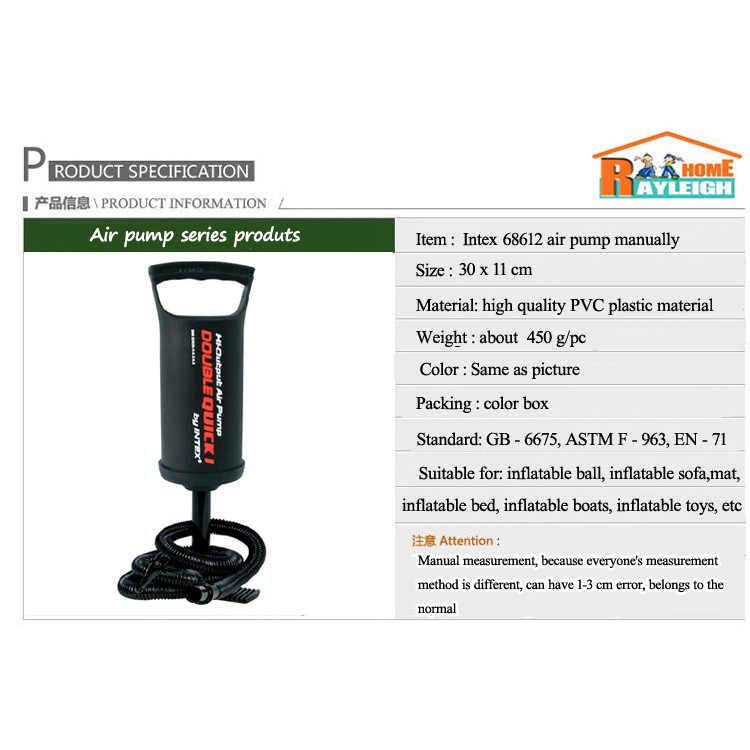 INTEX 68612 [NP10] 29CM Double Quick Hand Pump Manual Hand Air Pump Inflate Pam Angin Kolam Air Mandi Pelampung Tilam