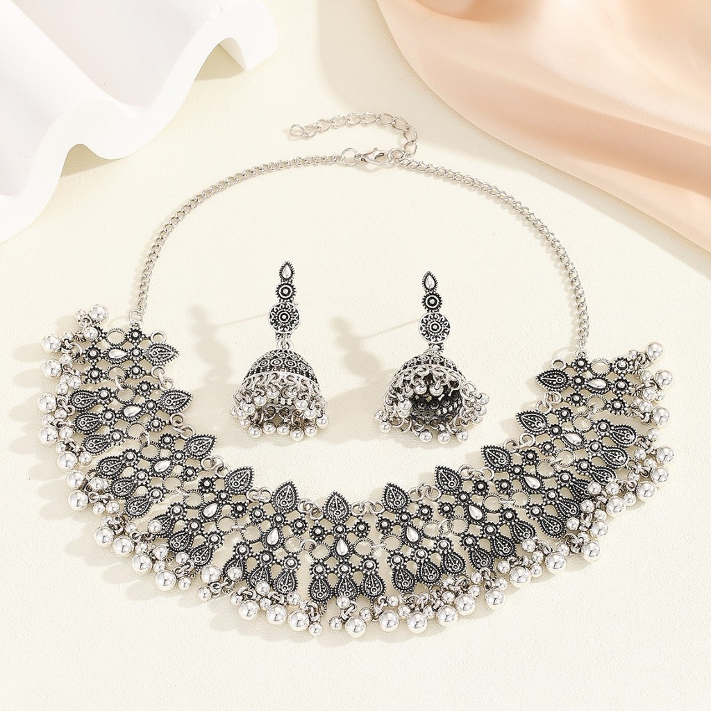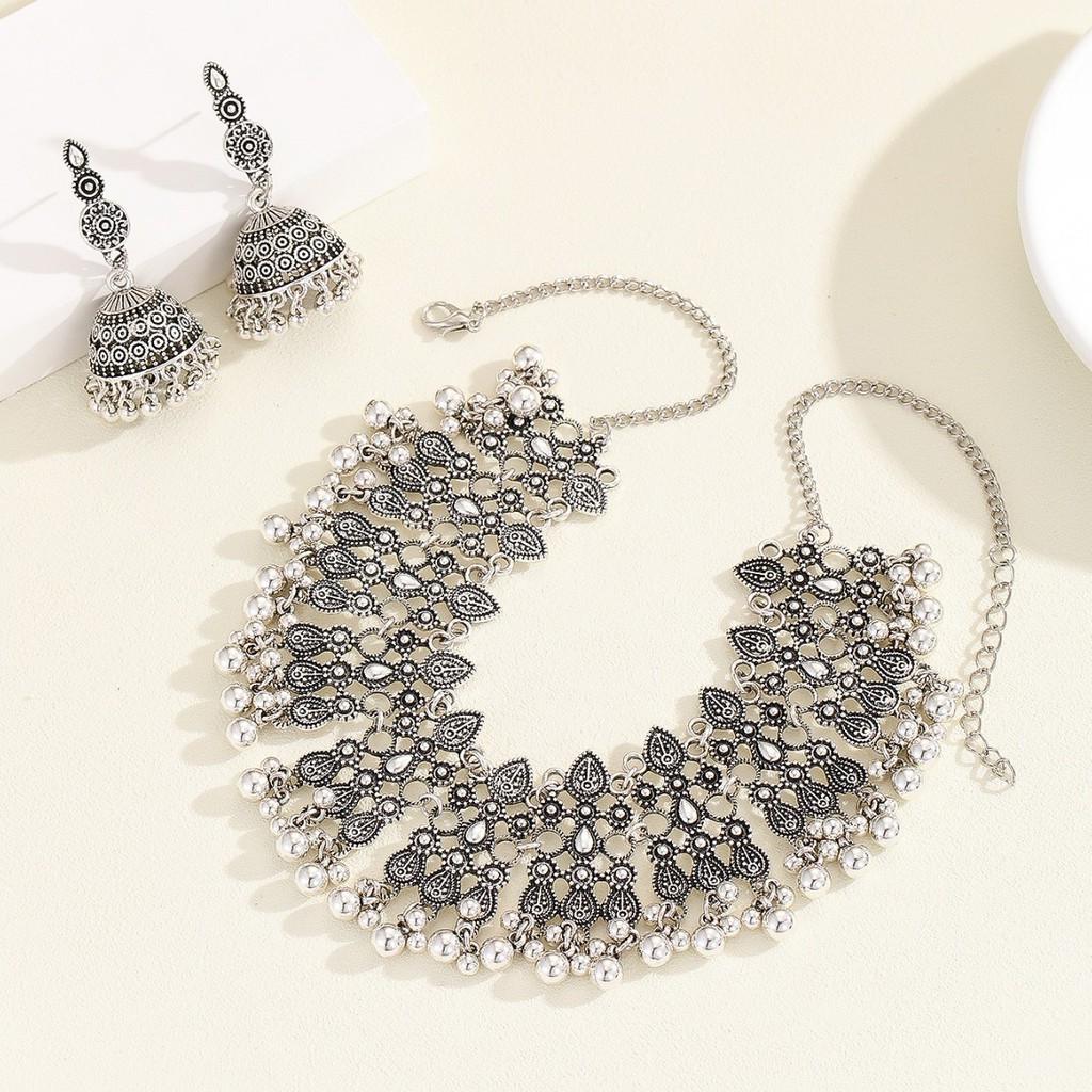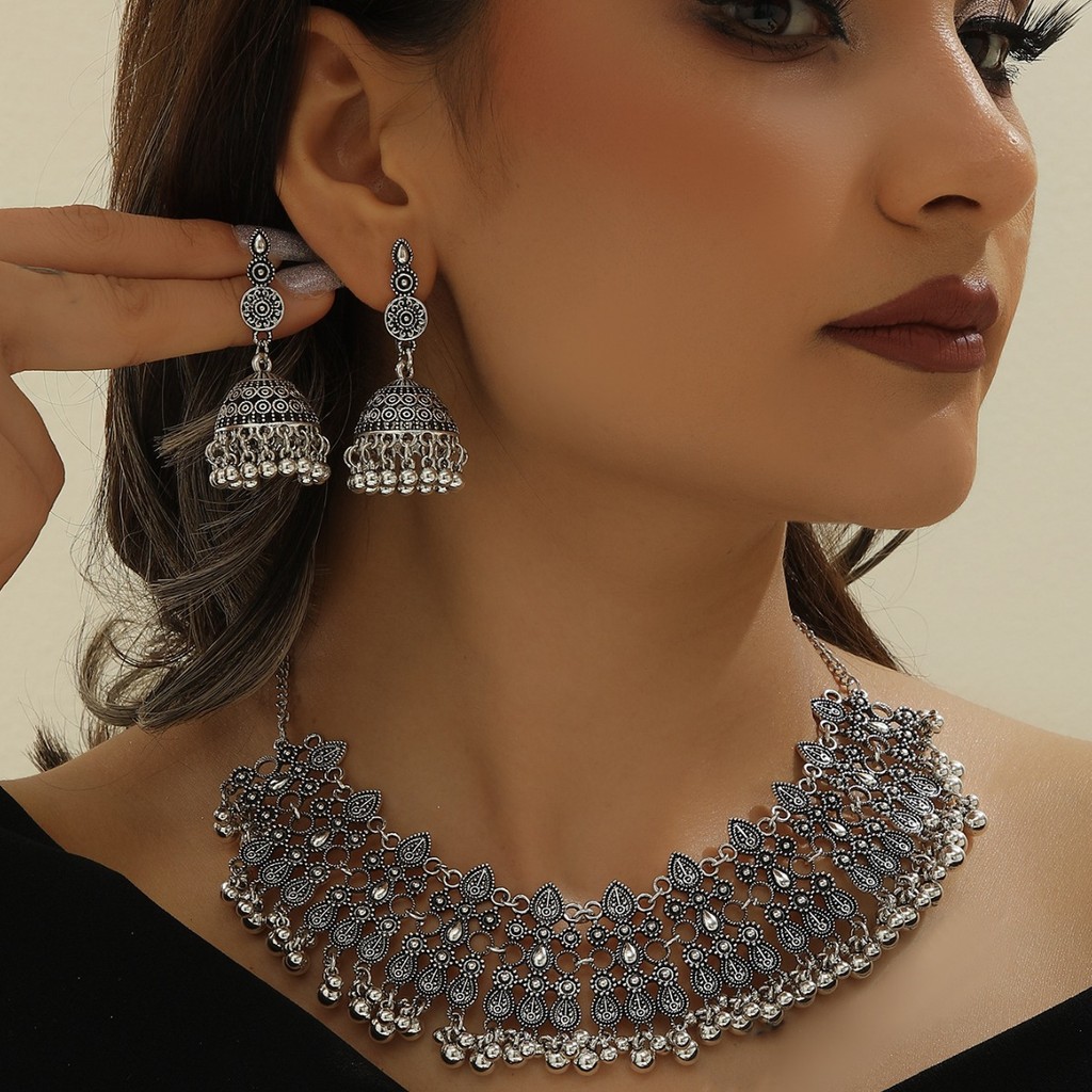 Indian Container Accessory Set, jhumka Style, vintaj Fashion, Bohemian Cutout, Two sut, Gem Necklace and Earrings, eropah and ame Style
