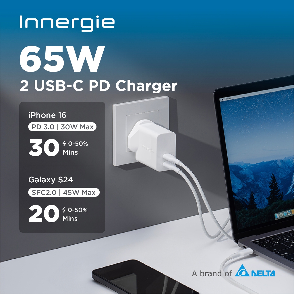 Innergie SE6 Duo 2 USB-C Charger, Support USB PD 3.0 (PPS) QC 4.0 Samsung Fast Charge 2.0