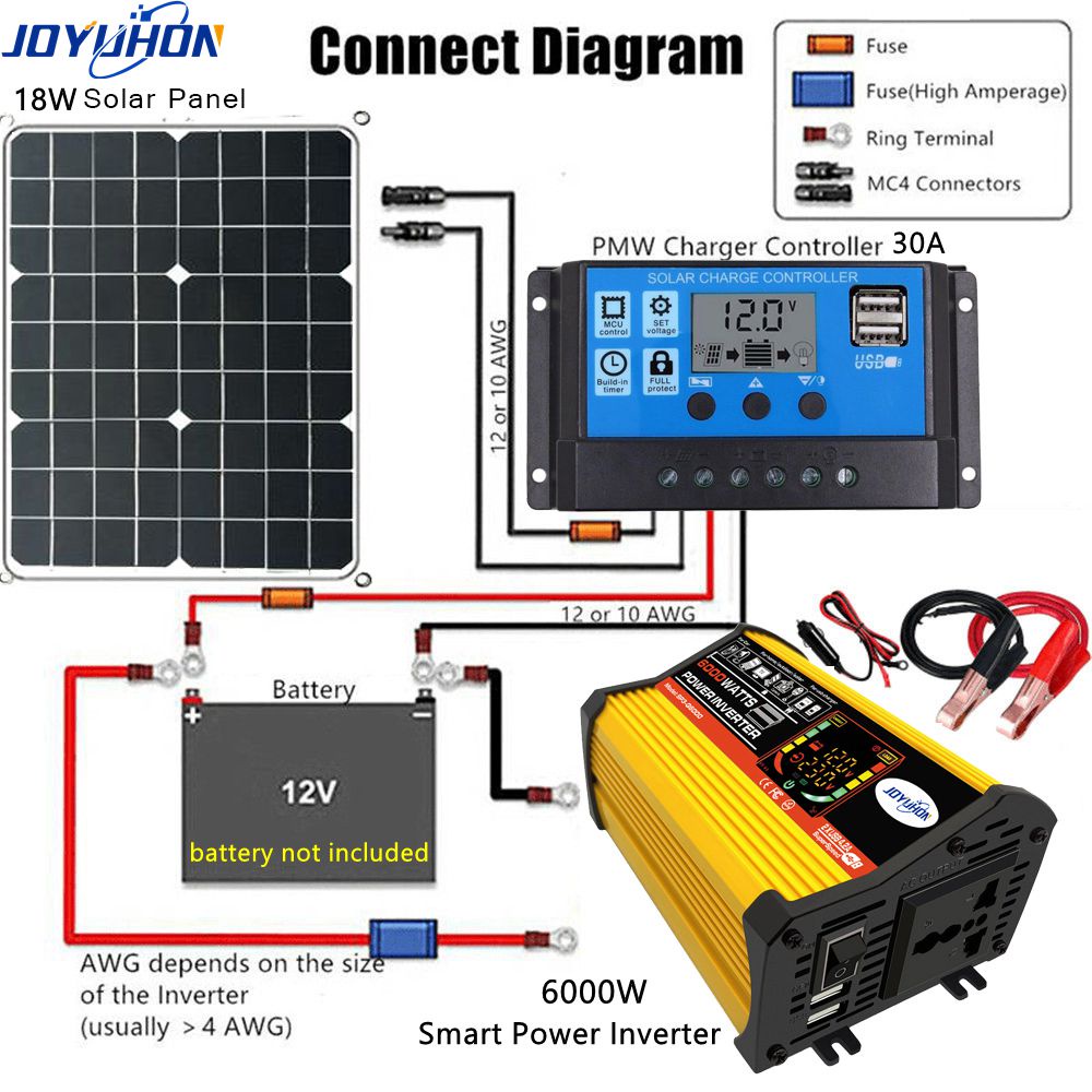 JOYUHON Solar Power System Kit 18W 18V Solar Panel+6000W Power Inverter DC12V to AC220V+30A Solar Charge Controller
