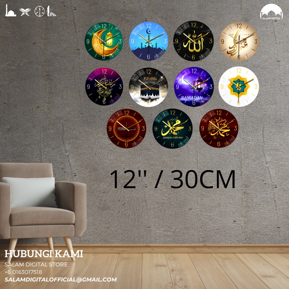 Jam Dinding Kaca Islamik / Islamic Wall Clock Glass / Silent Wall Clock Frameless Design 12" / 30CM