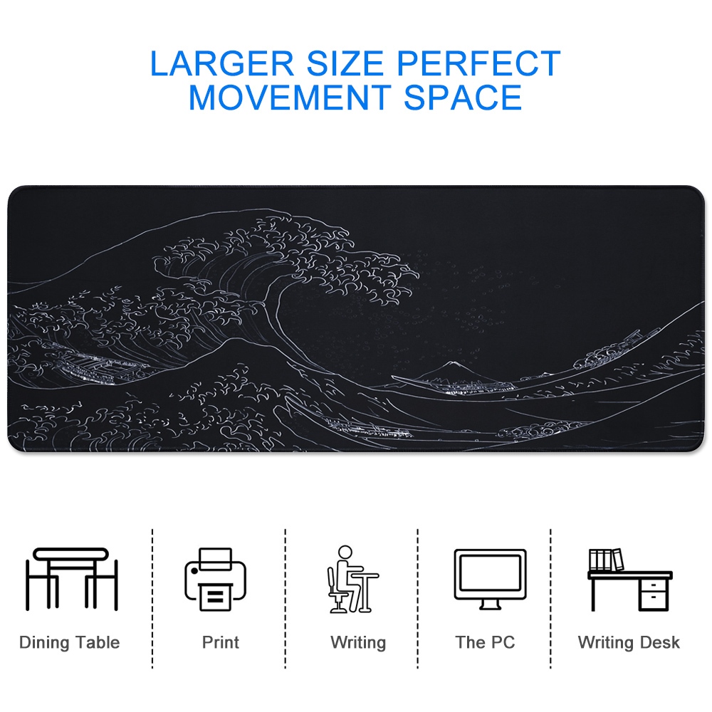 Large Gaming Mouse Pad, Japan Black Sea Wave Mousepads With Non-Slip Rubber Base Mouse Mat 100x50 / 90x40 / 80x30cm