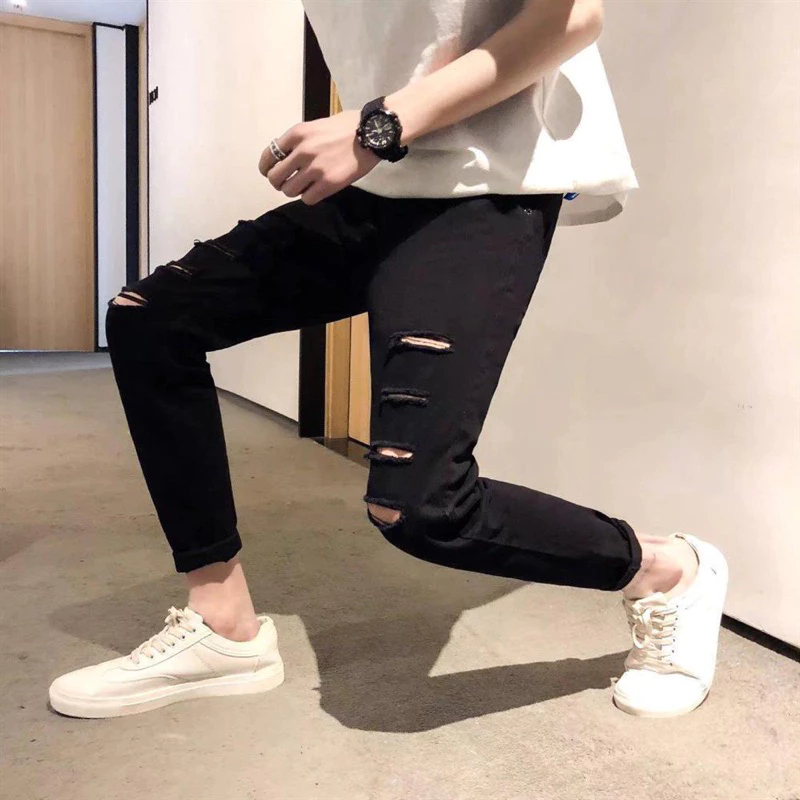 Jeans mens casual jeans seluar koyak Seluar Four Seasons Seluar Jeans Lutut