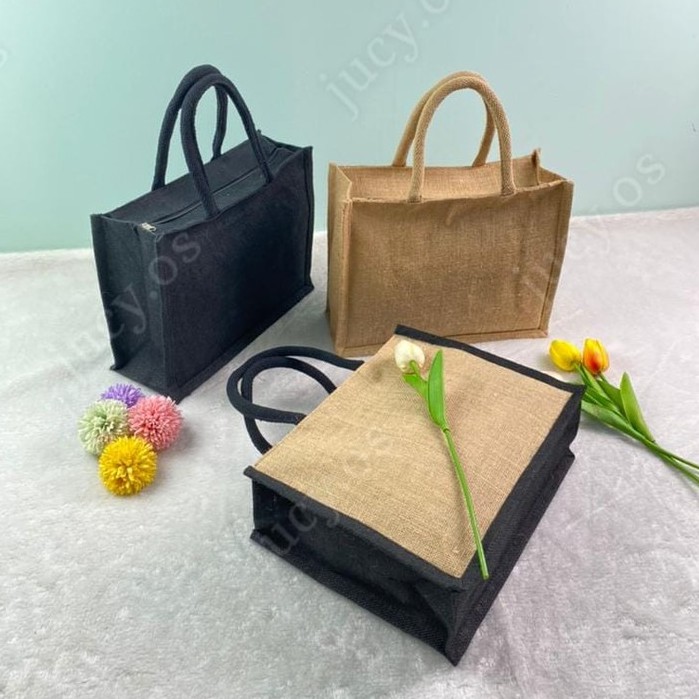 Jute Bag with Zip Plain Tote Bag Handbag Beg Tangan Wanita Shoulder Eco Bags Lunch Bag Jutebag Totebag