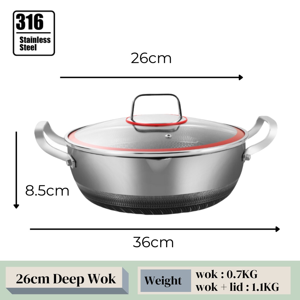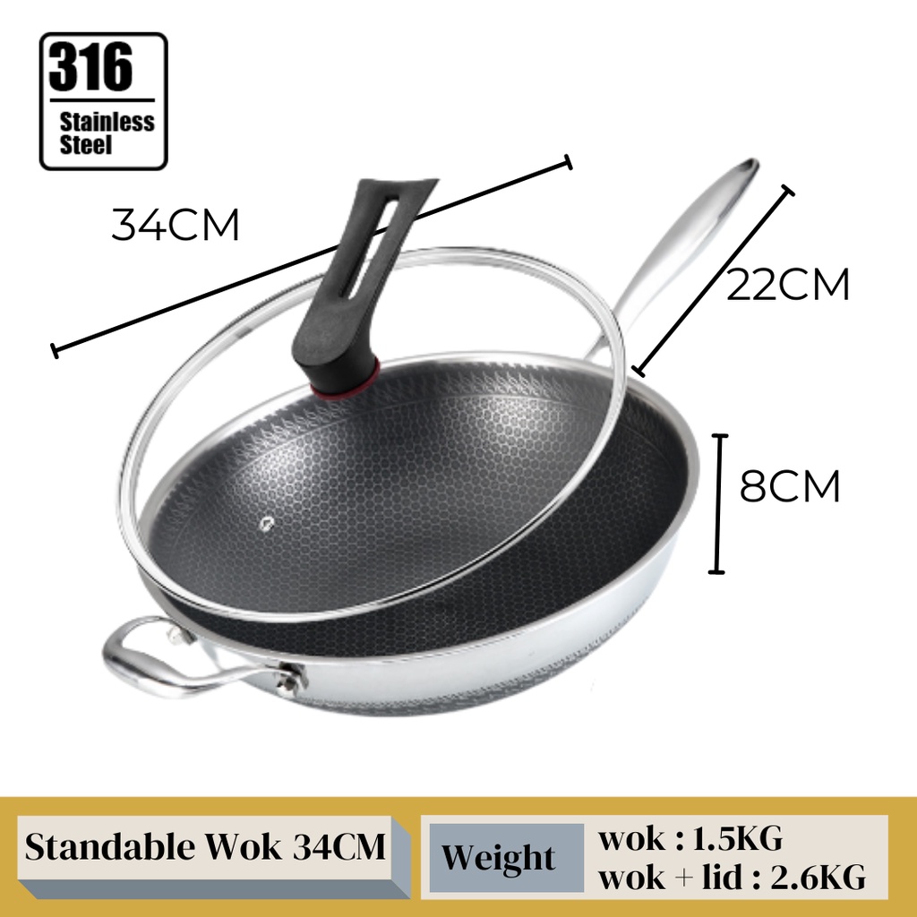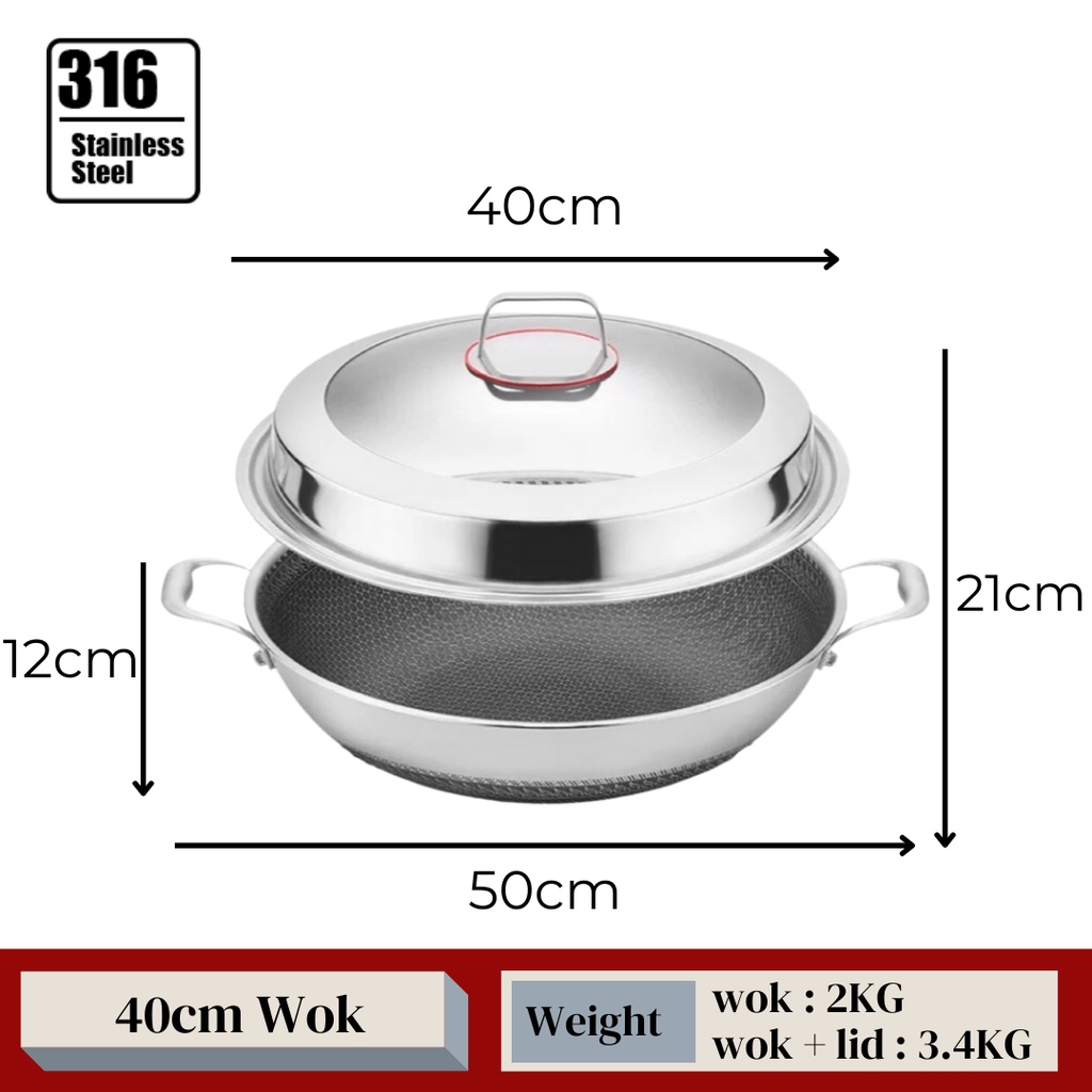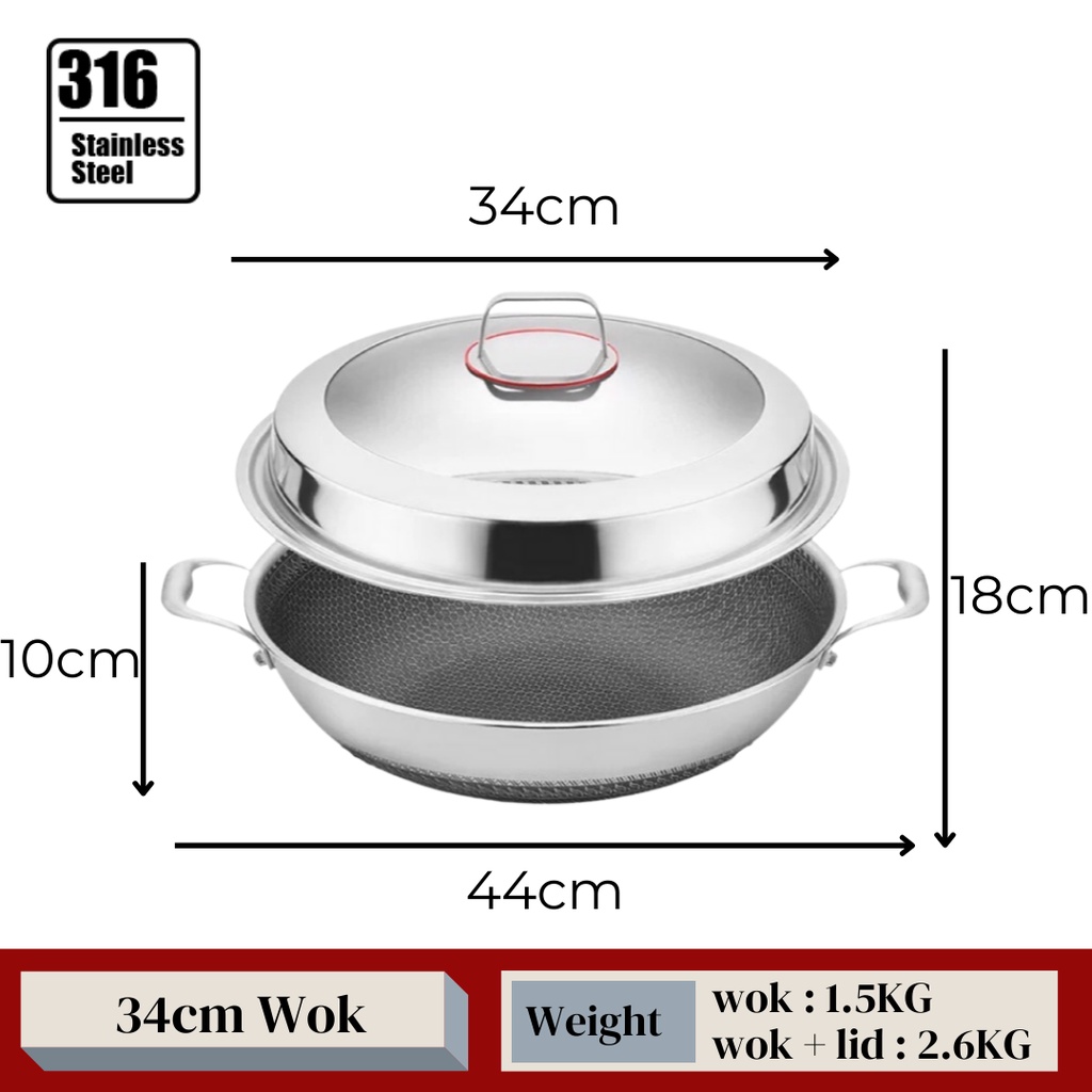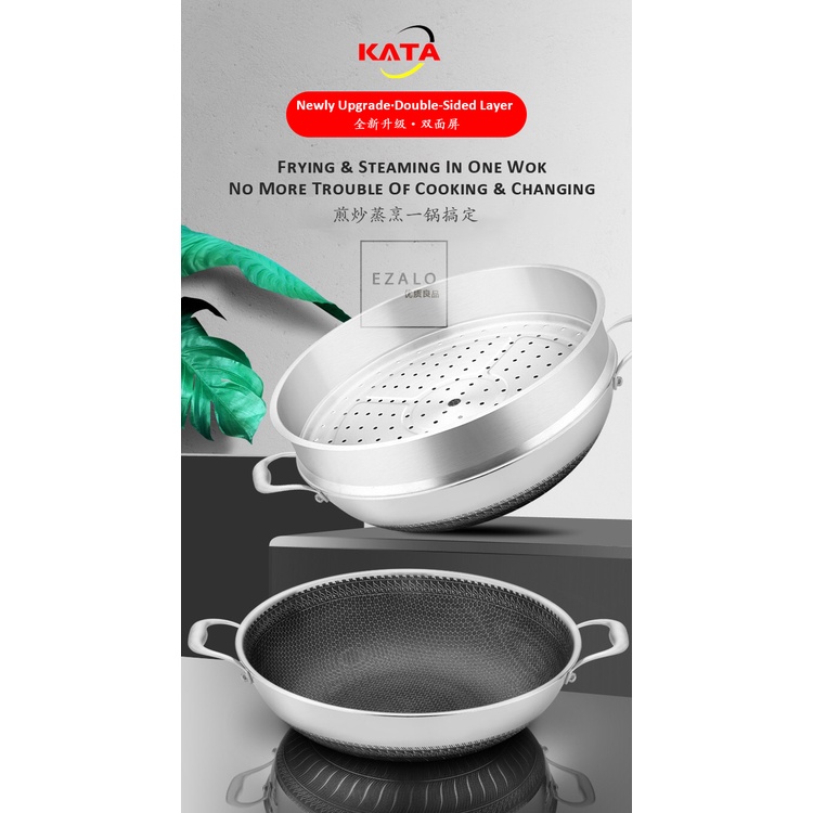 KATA Double Ear Handhold 316 Stainless Steel Honeycomb Pan Non-Stick Wok With Lid (34/36/38/40/42cm)