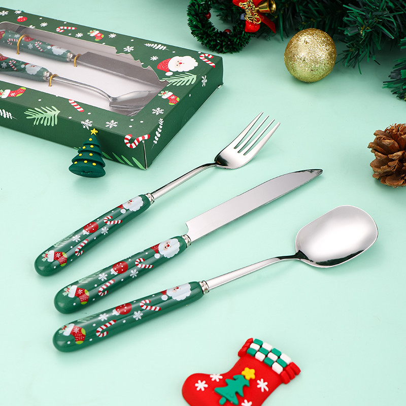 KATELV 304 Stainless Steel Christmas Cutlery Set Ceramic Handle Santa Claus Pattern Xmas Spoon and Fork Set Dinner Knife Dessert Spoon Fork for Gift