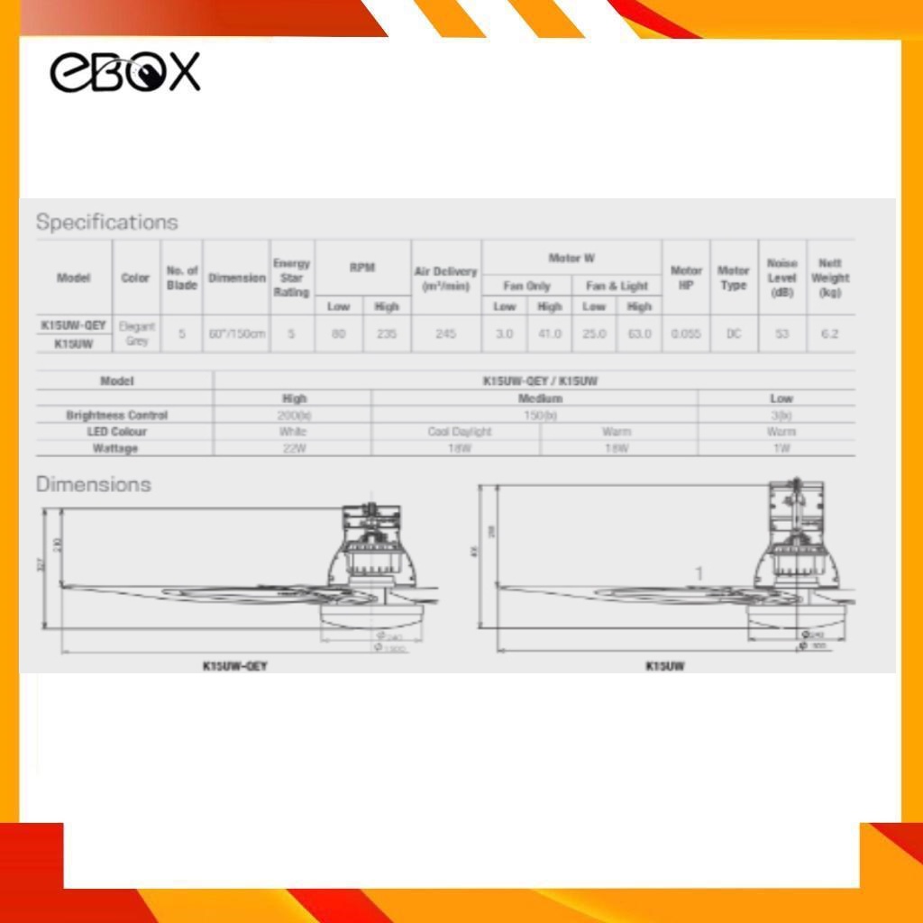 KDK K15UW-QEY 60" Remote Control Ceiling Fan DC Motor With LED Light (Grey)