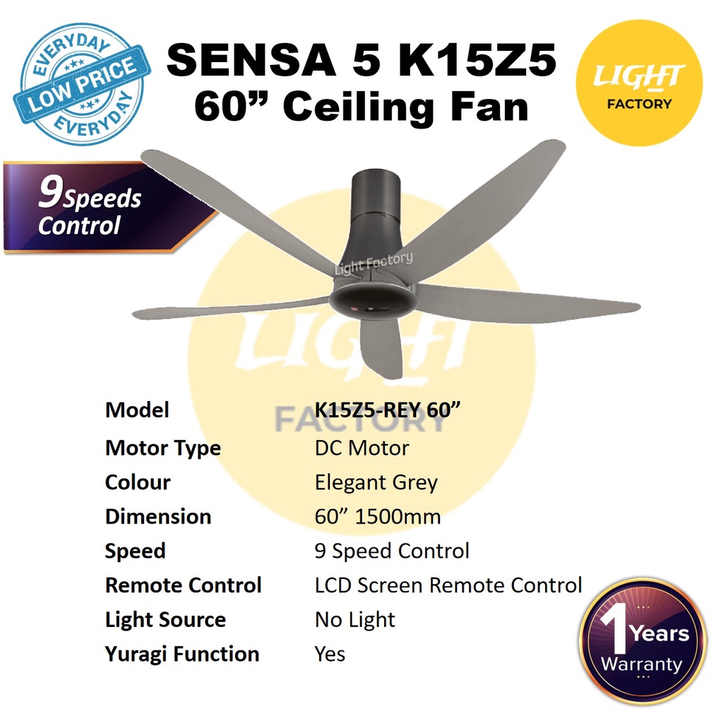 KDK SENSA 5 Series K15Z5-REY 60" 5 Blades DC Motor Ceiling Fan 9 Speeds Remote Control Grey Long Pipe Kipas Siling
